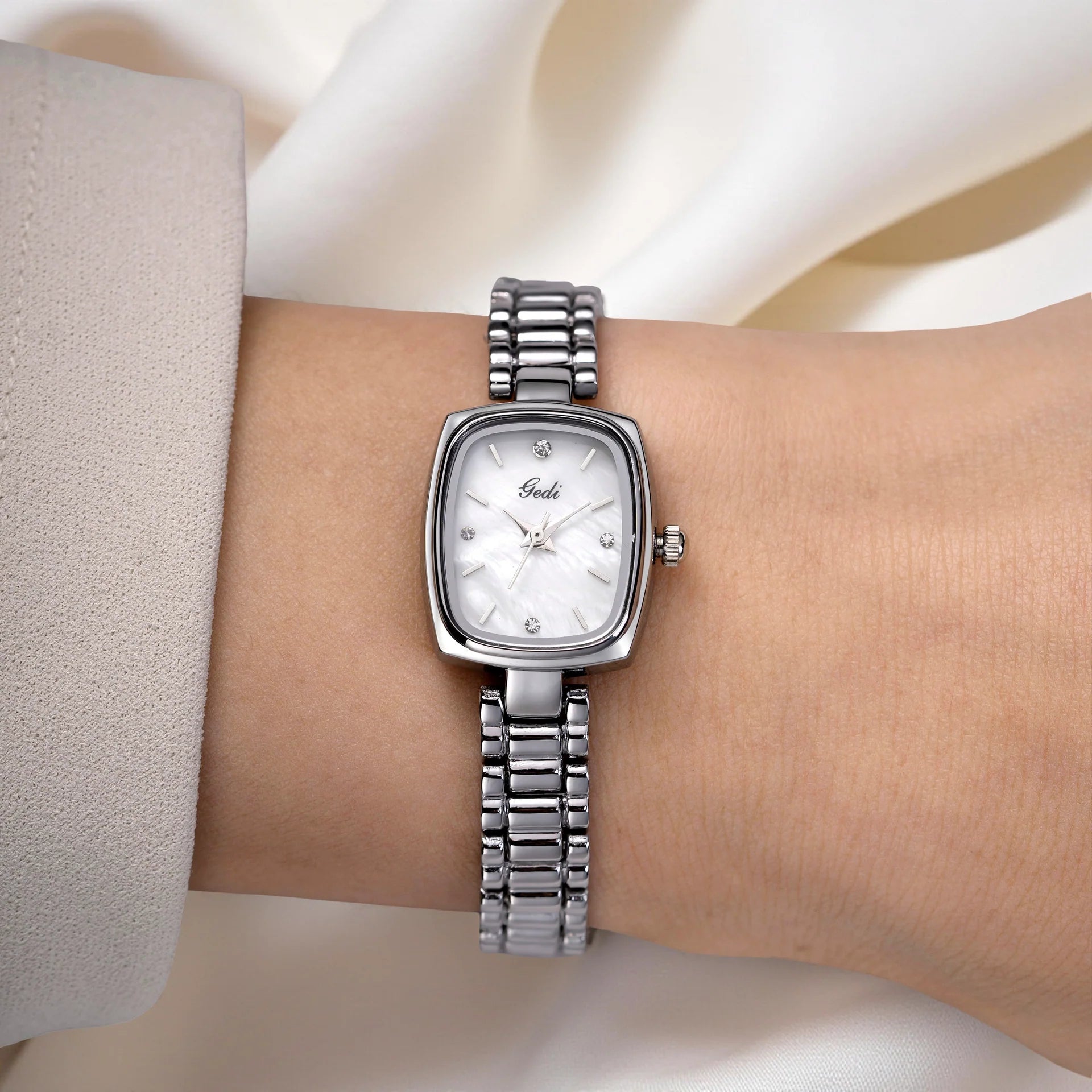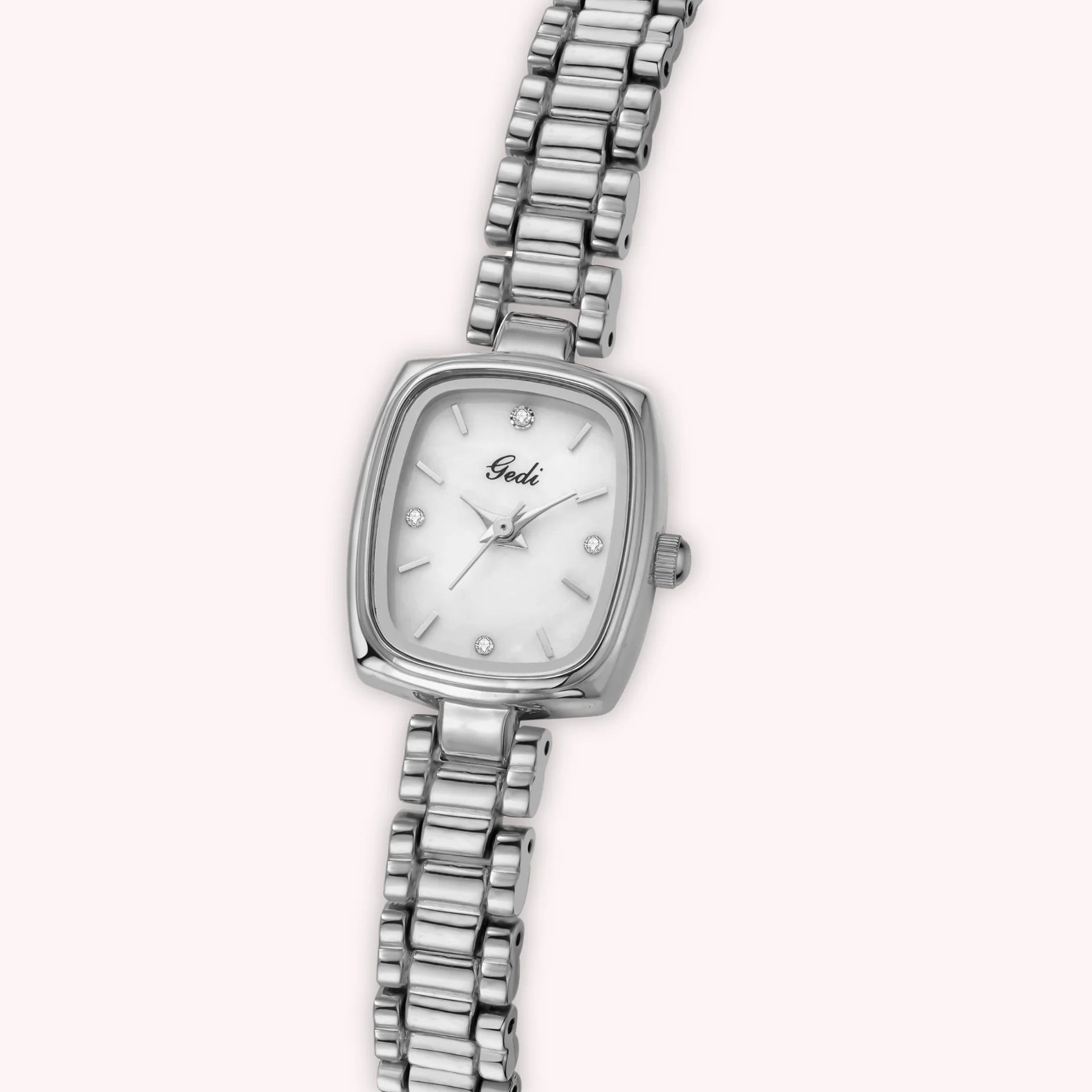 Delicate and elegant, the Celeste watch showcases a 19 x 22 mm pearl-white dial set against soft silver tones, exuding timeless sophistication. Crafted to enhance your style with effortless grace.